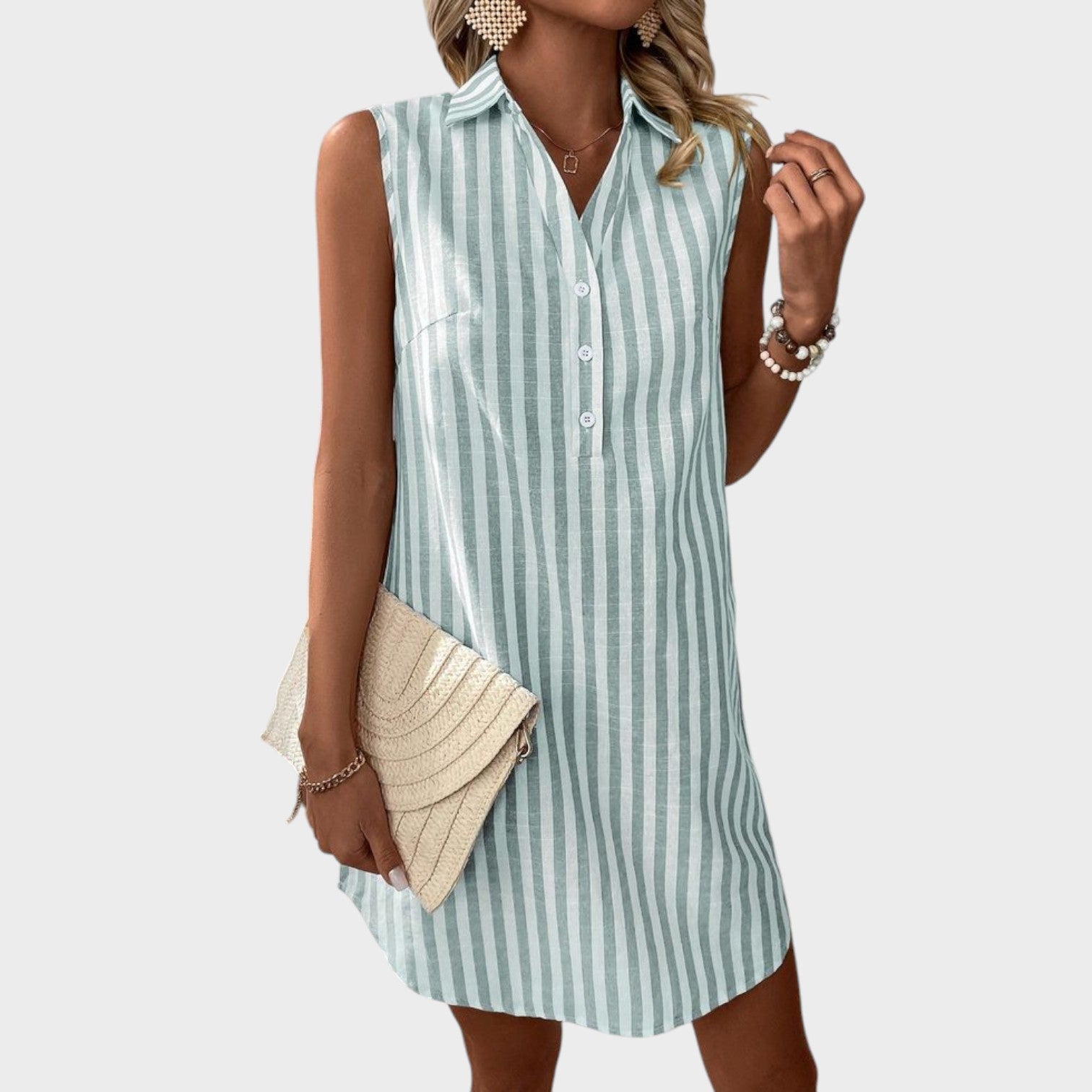 Con un diseño clásico y un toque desenfadado, este vestido de rayas sin mangas es la definición perfecta de frescura y elegancia casual. El corte recto, combinado con un tejido ligero, proporciona una comodidad absoluta para los días más templados, mientras que el cuello con botones añade un toque refinado al look. Ideal para paseos al aire libre, brunches y momentos de ocio que exigen estilo sin esfuerzo.