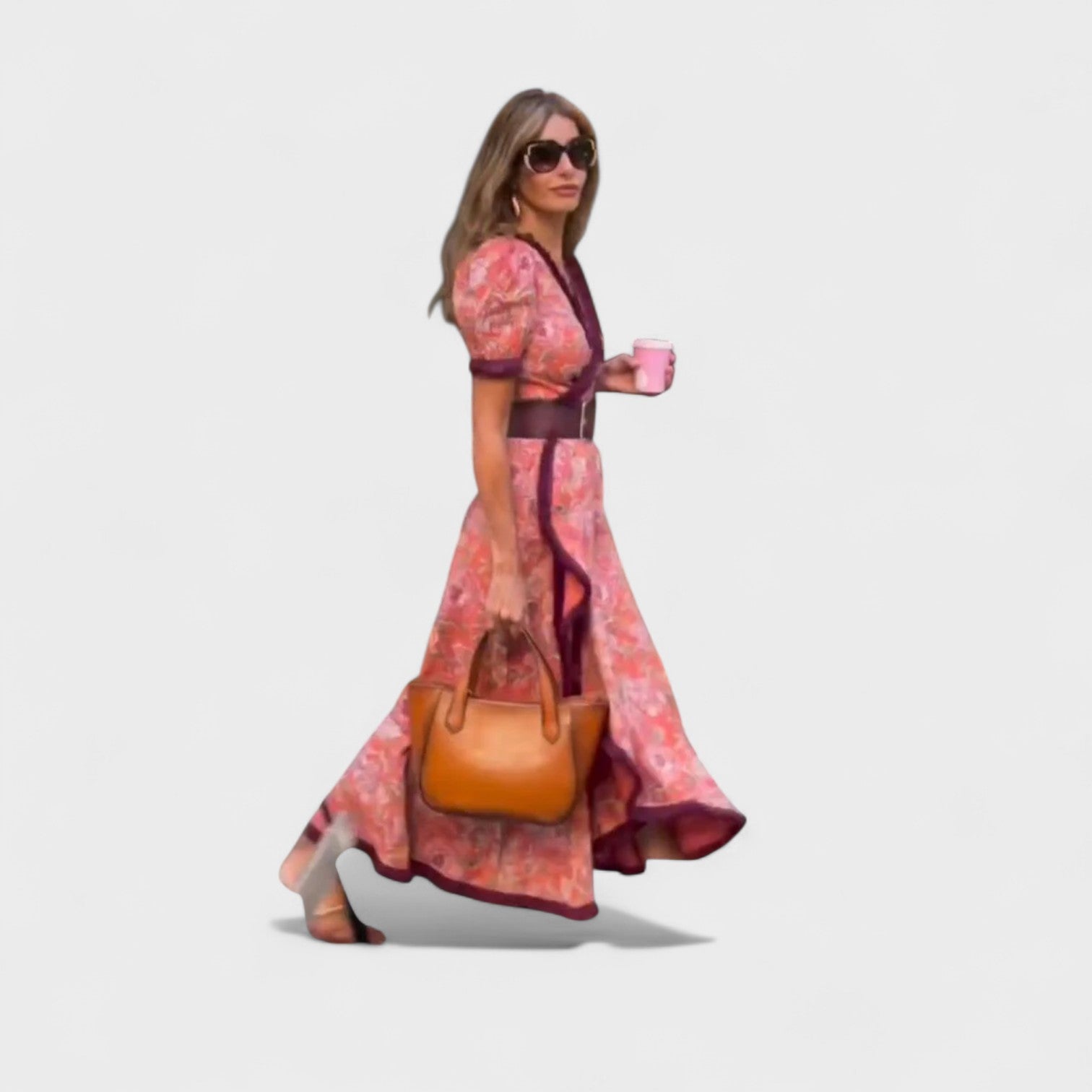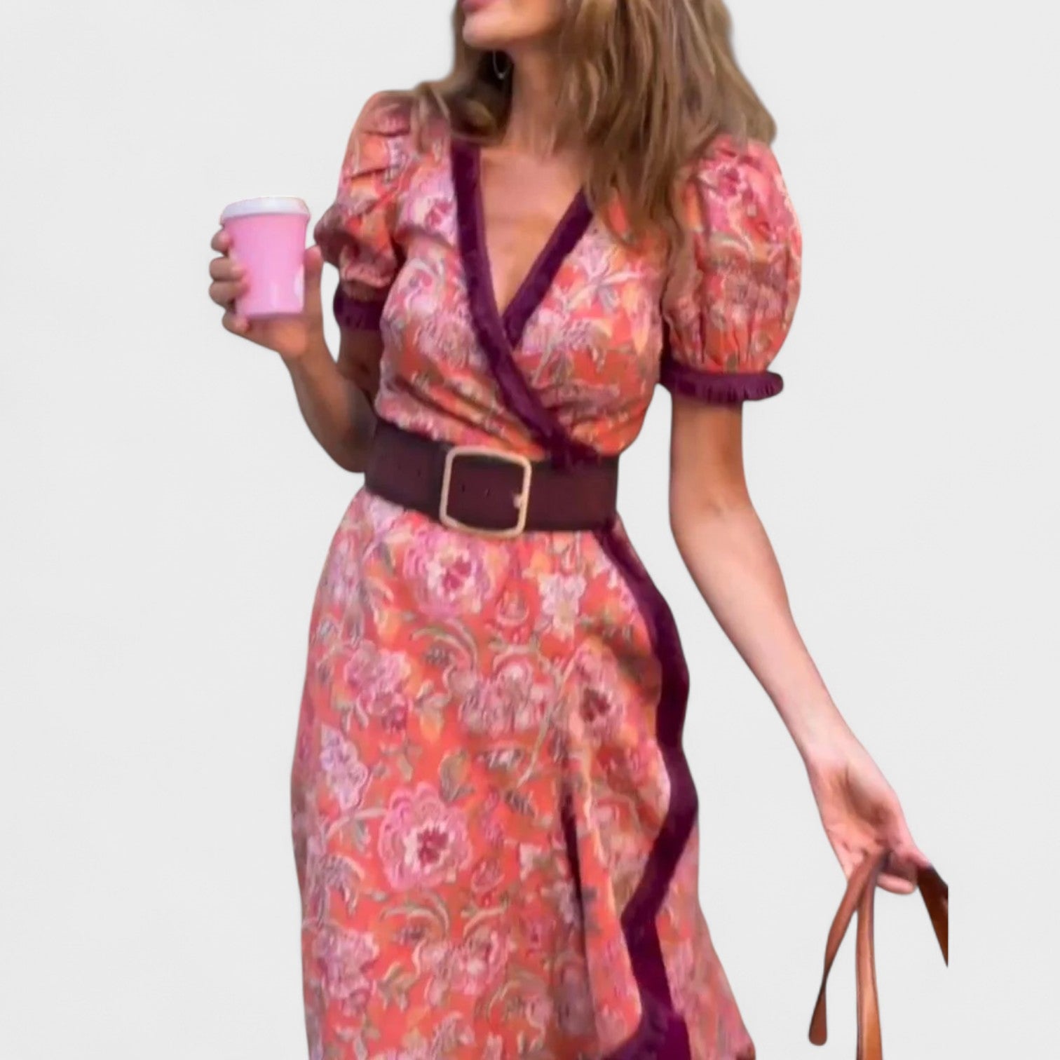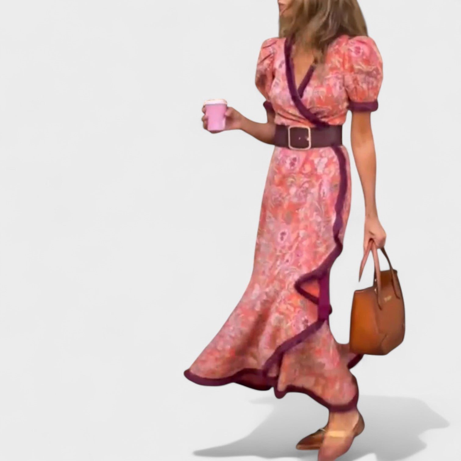 Este vestido largo con estampado floral, mangas abullonadas y detalles en contraste es una pieza que destaca por su feminidad y personalidad. El diseño cruzado en el escote y el cinturón ancho acentúan la cintura, mientras el bajo con volantes crea un movimiento fluido y encantador. Ideal para paseos, brunches o eventos casuales donde quieras irradiar estilo sin esfuerzo.