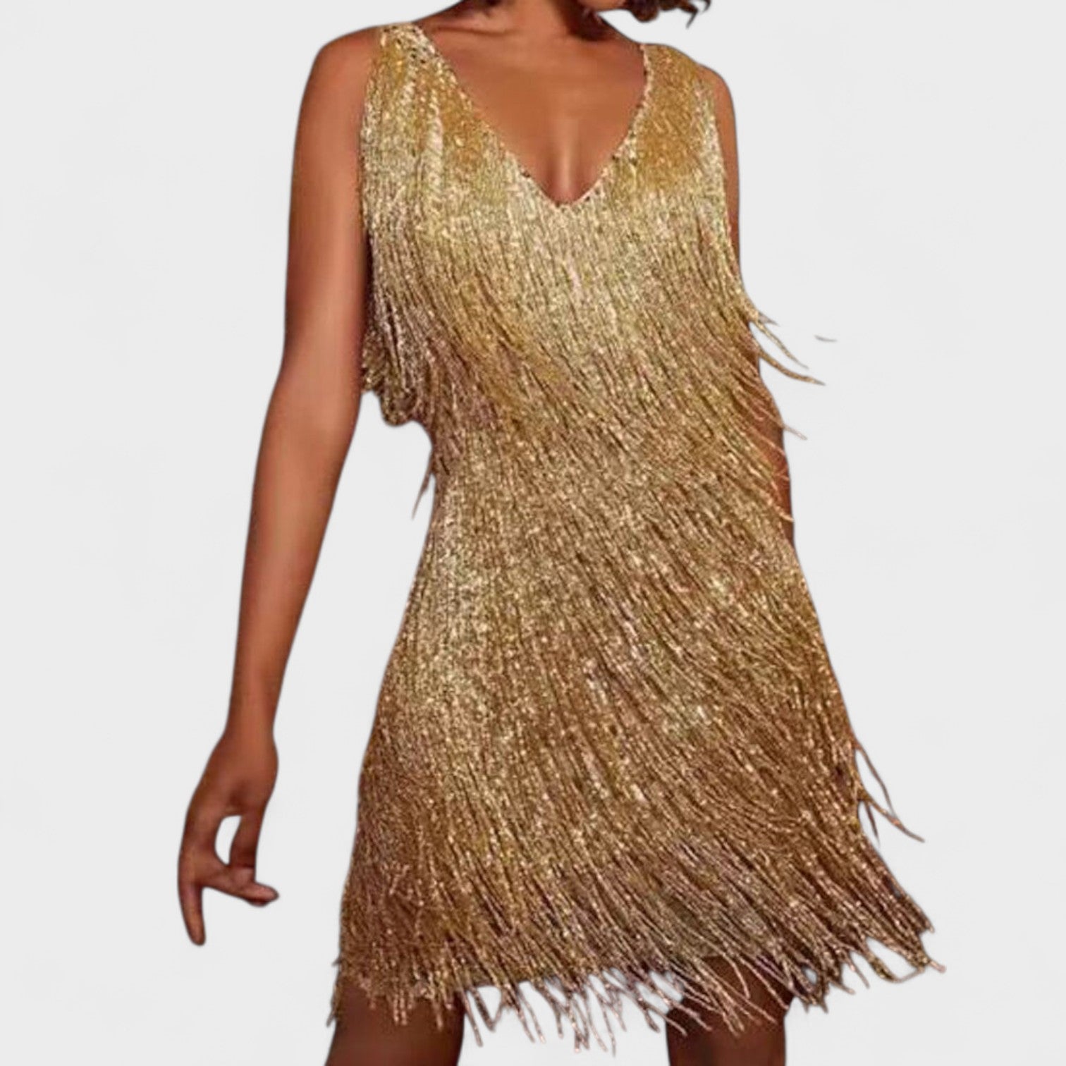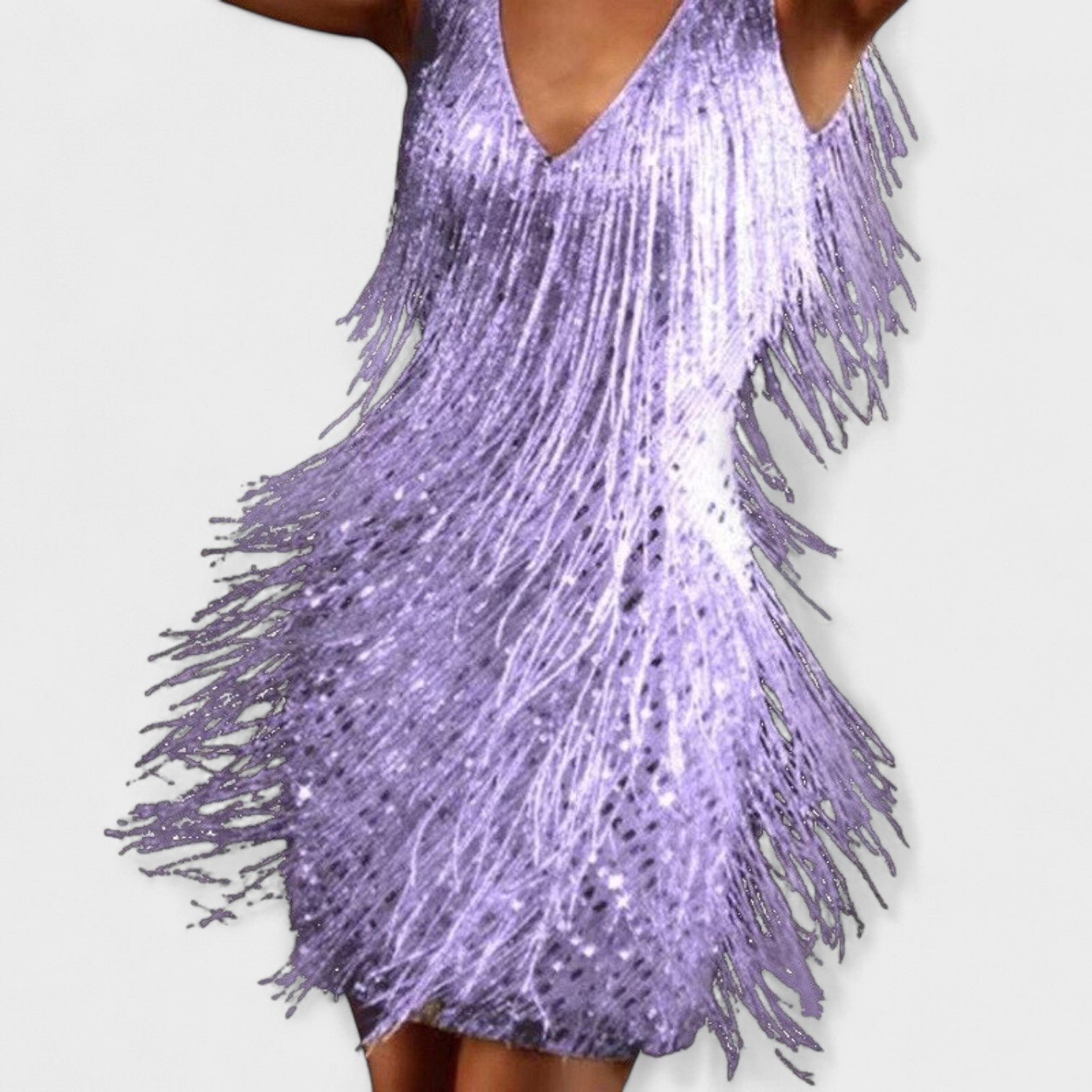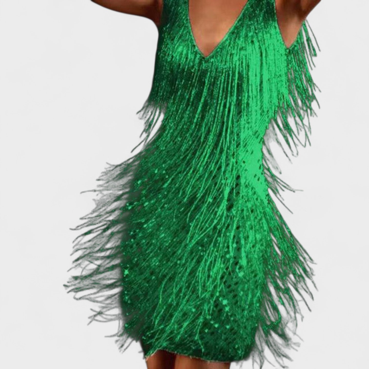 ¡Este vestido de flecos es pura energía y glamour! Con un movimiento fluido y un brillo deslumbrante, está diseñado para robar todas las miradas en la pista de baile y en los eventos más memorables. El corte corto y el escote en V realzan la silueta con un toque sexy y moderno, mientras los flecos crean un efecto hipnótico a cada paso. ¡La pieza perfecta para quienes aman ser el centro de atención!