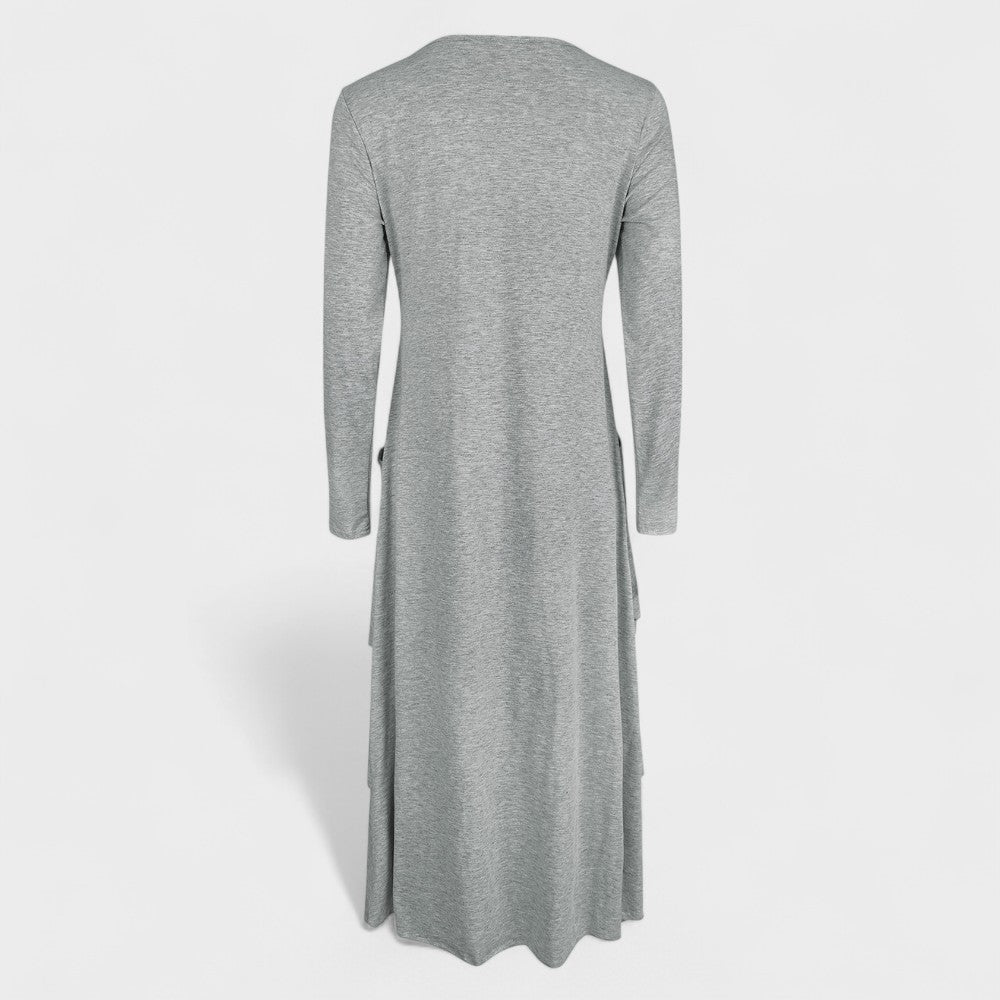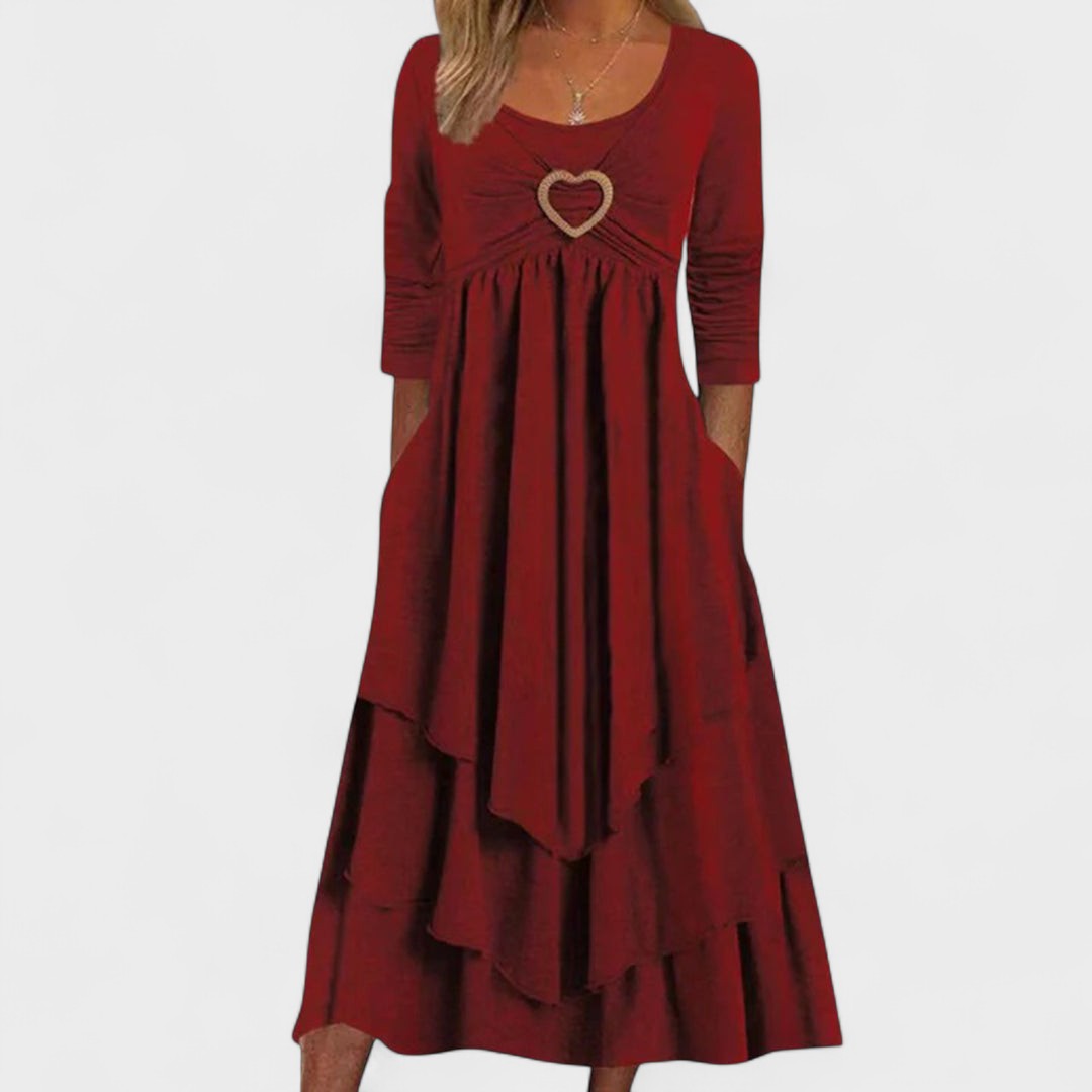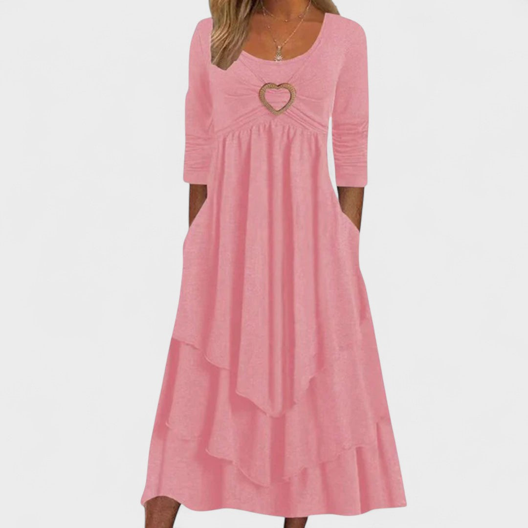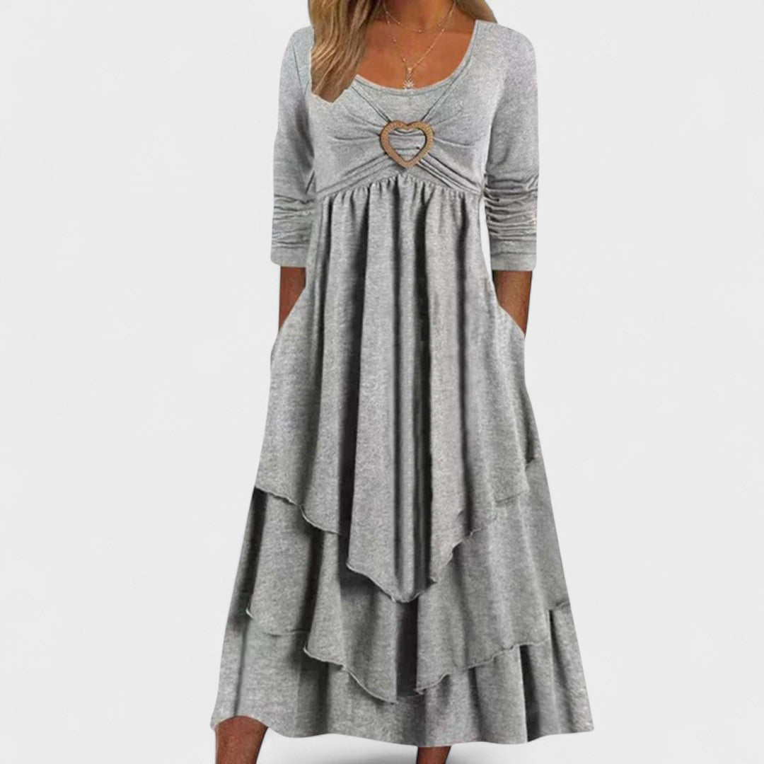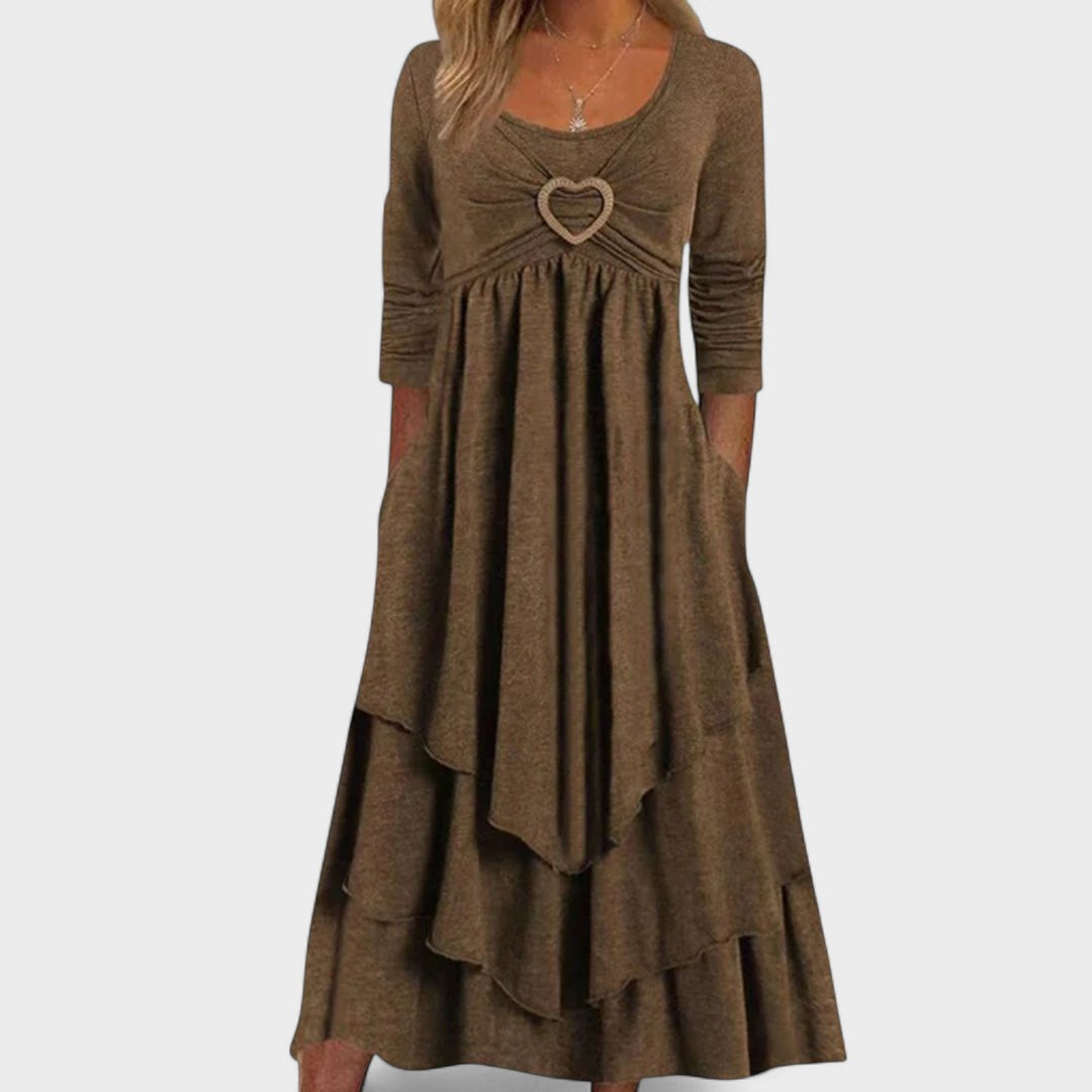 Este vestido largo es la combinación perfecta entre comodidad y feminidad. Con su caída fluida y su diseño en capas, aporta un aire bohemio y encantador, ideal para quien busca lucir bien sin esfuerzo. El detalle del corazón en el escote añade un toque romántico y único que no pasará desapercibido. Perfecto para tardes relajadas, paseos o simplemente sentirte especial en cualquier momento del día.