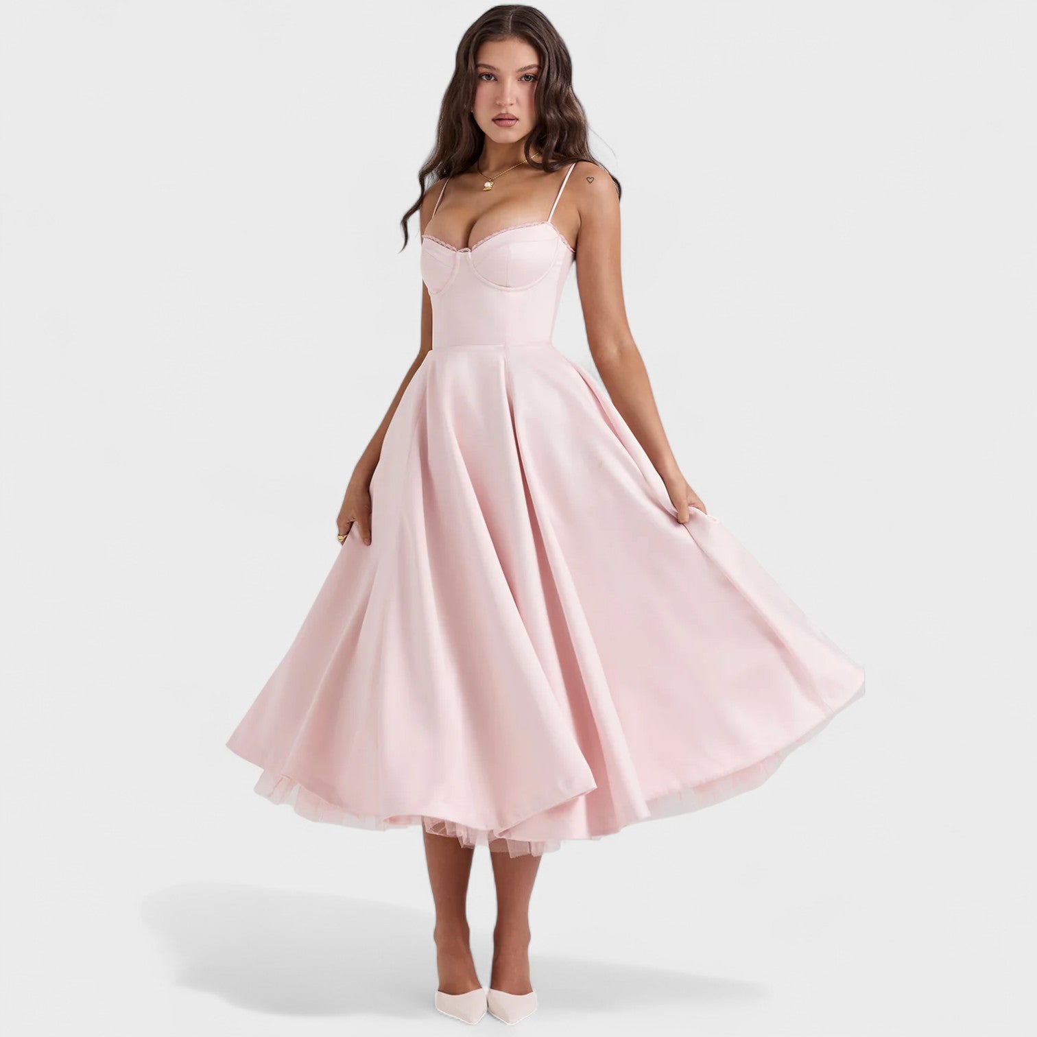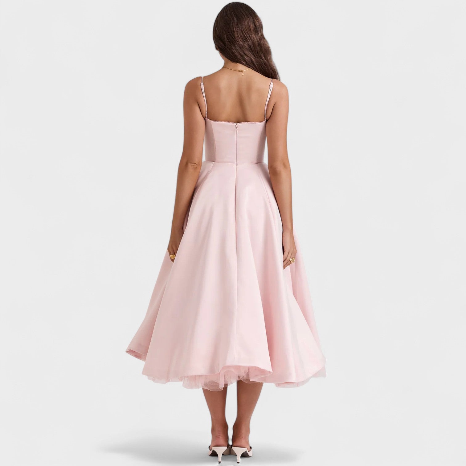Corte que realza la silueta: corsé estructurado y falda amplia que destacan la cintura y brindan un look femenino y elegante.