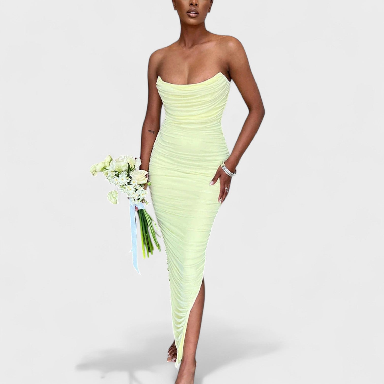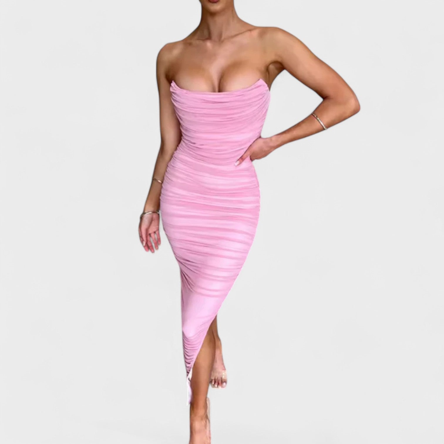 Este vestido de corte ceñido y diseño asimétrico fue creado para destacar la silueta con sensualidad y clase. Su escote sin tirantes y fruncidos estratégicos aportan un toque sofisticado que eleva cualquier ocasión especial. Ideal para fiestas, eventos o celebraciones donde tu presencia no pasará desapercibida.