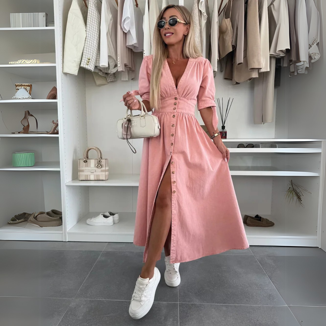 - Modelo que realza la silueta: El escote en pico, la cintura entallada y la abertura en la falda crean un efecto alargador, resaltando la silueta sin apretar demasiado.